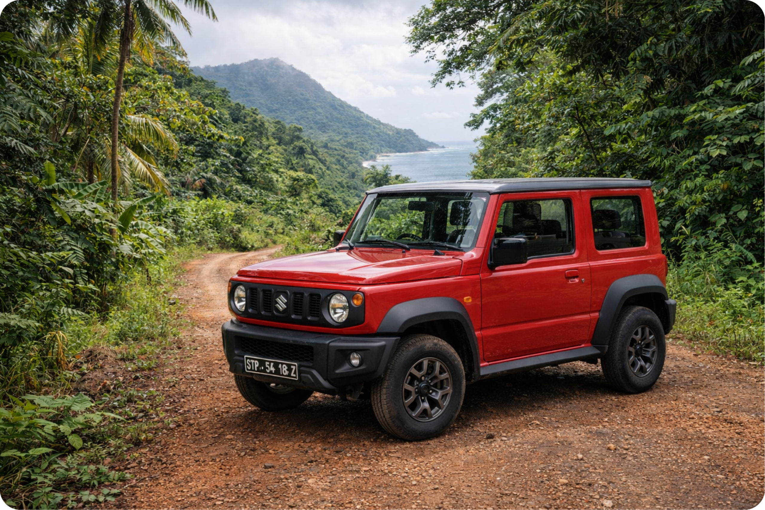Pequeno mas imbatível fora de estrada. O Suzuki Jimny é o companheiro perfeito para explorar os cantos mais escondidos de São Tomé ágil, robusto e com tração 4×4 real para chegar onde outros não chegam.